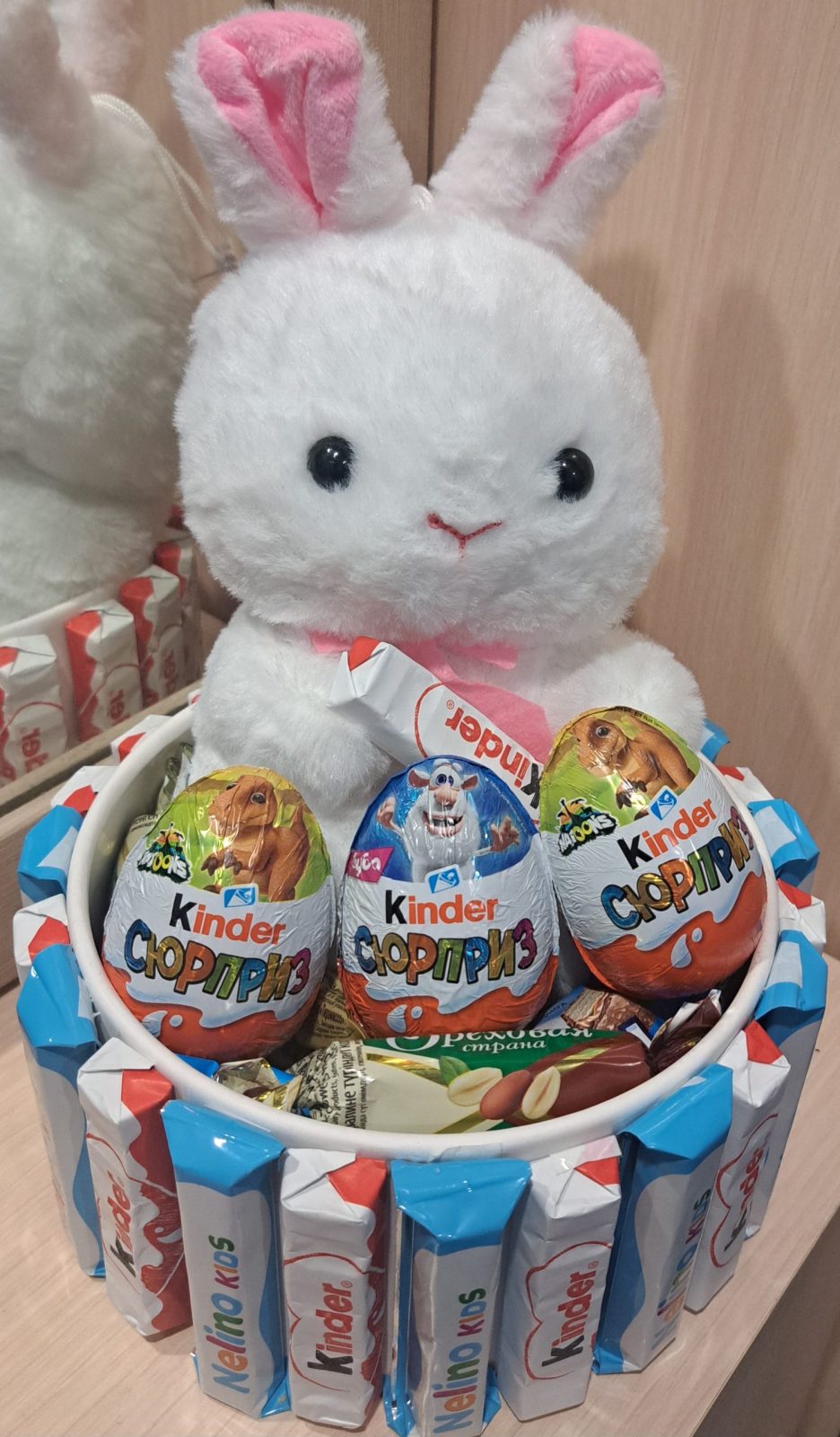 Входит игрушка мягкая, 3шт киндер яйца, киндер шоколад, конфеты разные, упаковка и бант